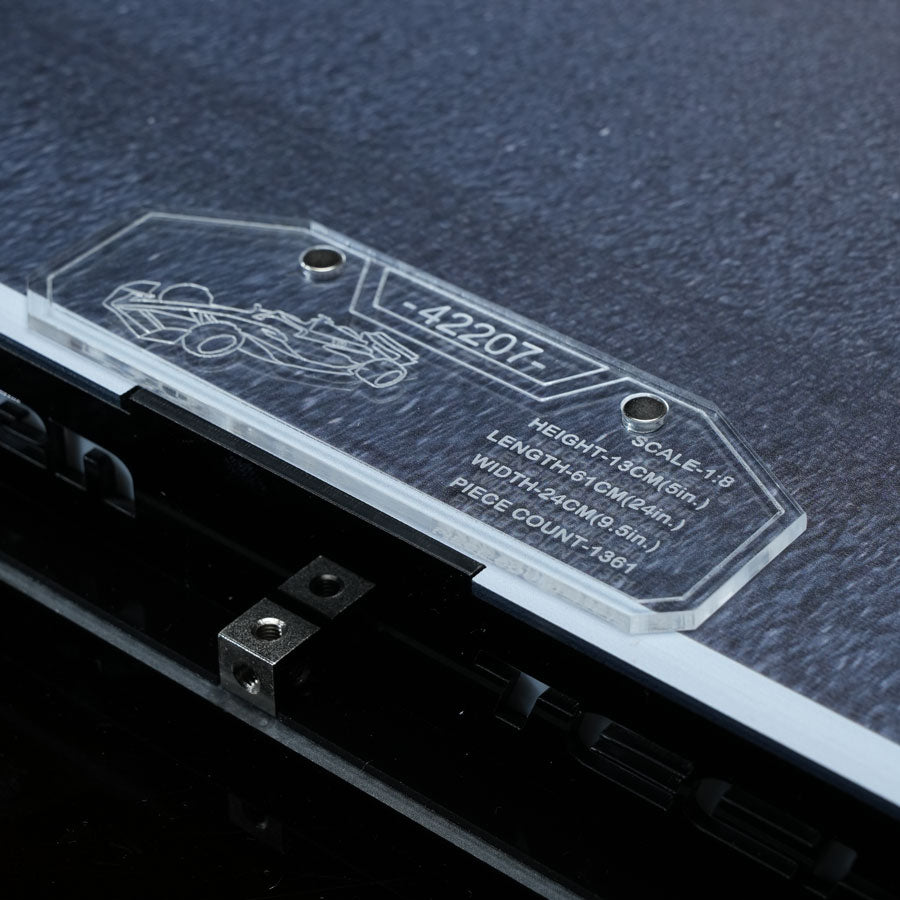 Elevate your display with a sleek Magnetic Information Board that seamlessly attaches to the case. Crafted with precision and clarity, this board allows you to showcase key details of your LEGO® Technic F1 model — such as model name, set number, and specifications — in a clean and stylish format. The magnetic design ensures easy placement and adjustment without the need for adhesives or tools, keeping your display professional and clutter-free